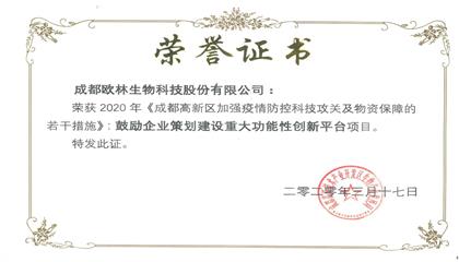 尊龙凯时生物疫苗研究院荣获2020年《成都高新区加强疫情防控科技攻关及物资保障的若干措施》:鼓励企业策划建设重大功能性创新平台项目